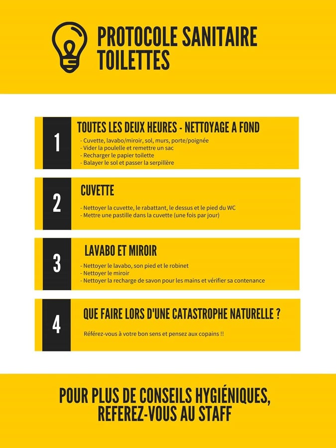 => Les toilettes sont accessibles. Un protocole de nettoyage a été mis en place et sera suivi par le staff. Vous pourrez aussi le suivre après votre passage aux « petits coins ». Merci d’être responsable et de nous aider dans le suivi de ce protocole.
