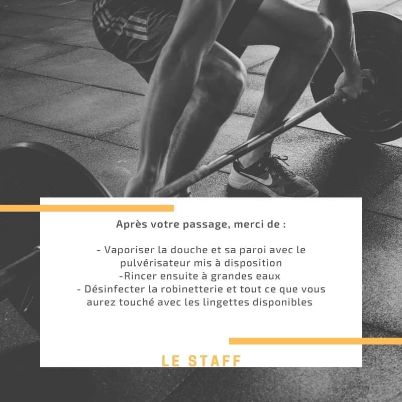 Nous attirons donc votre attention sur le fait que seules les personnes ayant une obligation professionnelle ou une urgence pourront utiliser les douches. Nous pensons notamment aux adhérents des cours du matin et de 12h30 qui devront repartir au travail. Nous ne souhaitons pas ouvrir les douches aux cours du soir, sauf cas particulier ou professionnel. Pareillement que pour les toilettes, vous devrez OBLIGATOIREMENT suivre le protocole sanitaire après votre passage.